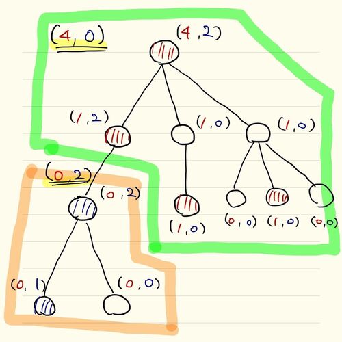 問題概要 原文 → Problem - F1 - Codeforces 頂点からなる木が与えられ、各頂点は赤・青のどちらかで塗られているか、何も塗られていないかのいずれかである。 木の辺を 1 つだけ取り除き、同じ連結成分内には色が高々 1 種類まで登場するようにしたい。これ…